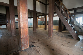 At the north front of central area there stands a three story three floor main tower. It is a quite simple tower equivalent to three story turret of other castles such as Takamtsu castle or Akashi castle (Hyogo prefecture), and also has nothing special interior as main tower. But the front side exterior is decorated by wood boards and decoraton roofs. Even though having large buildings, Marugame castle was a secure castle guarded sheer stone walls and barrack turrets.