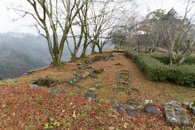 Just below the hilltop area there was a narrow terraces between mountain and river, and was used as a guardian’s place. At the west of the castle, castle town was built at flat area protected by curving river. Total length of castle including castle town exceeds 1.5 kilometer, and it was equivalent to the castle of the lord which was double or triple size territory.